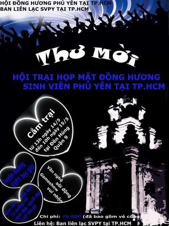 Sau khoảng thời gian dài mong ngóng chờ đợi thì Hội trại họp mặt đồng hương tỉnh Phú Yên sẽ diễn ra 2 ngày 1 đêm, từ 13h00 thứ 7 ngày 14 tháng 05 năm 2011 đến 10h00 chủ nhật ngày 15 tháng 05 năm 2011 tại Khu du tích lịch sử Đền Hùng, Quận 9 (thay cho chương trình Họp truyền thống đồng hương tình Phú Yên 30/4 hằng năm tại ĐH Bách Khoa) với những nội dung chính như sau: