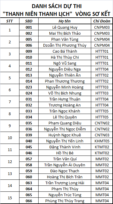 Như đã thông báo đến các thí sinh dự thi Hội thi Sinh Viên Thanh Lịch vào cuộc họp sáng thứ bảy 6/11/2010 vừa qua, BTC Hội Thi thông báo lại một lần nữa đến các cặp thi Sinh Viên Thanh Lịch đi tiếp vào vòng 2 như sau: